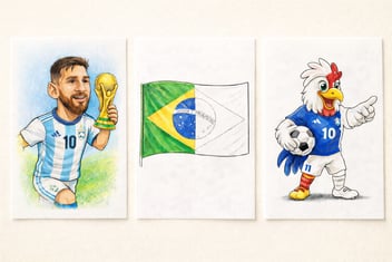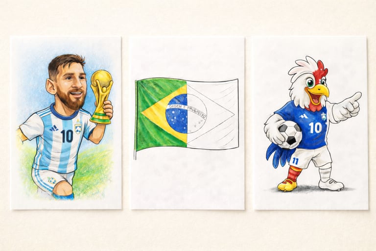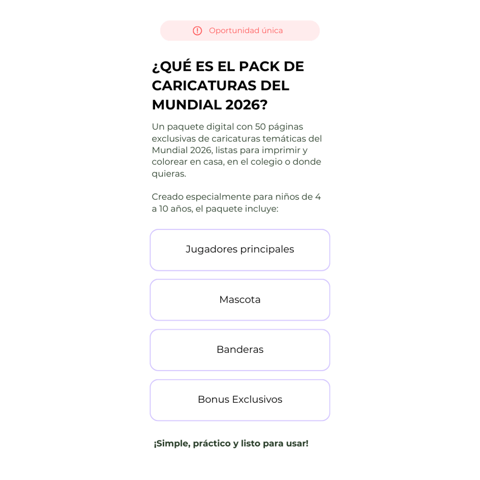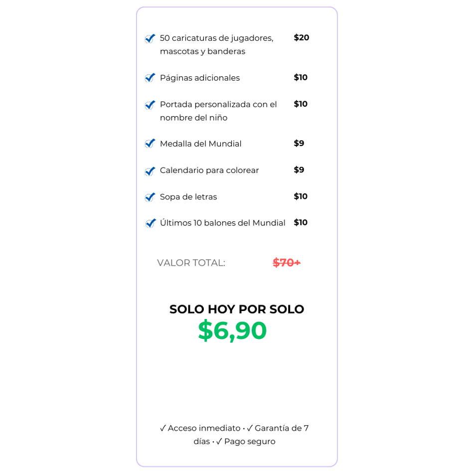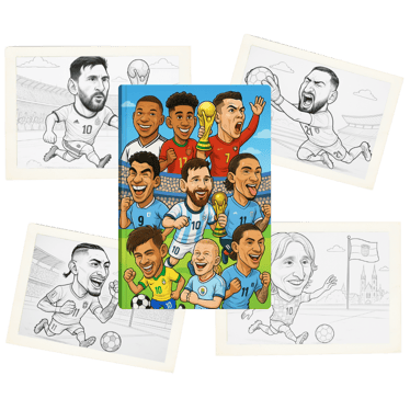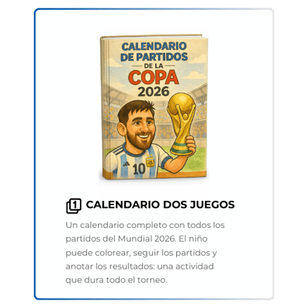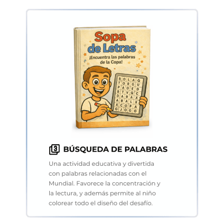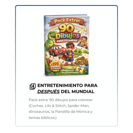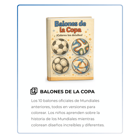 Recibirás un paquete digital con 50 páginas para colorear en formato PDF, que incluye caricaturas del Mundial, actividades especiales y 4 extras exclusivos: una medalla, un calendario de partidos, una sopa de letras y balones históricos del Mundial. Todo listo para imprimir y usar de inmediato.